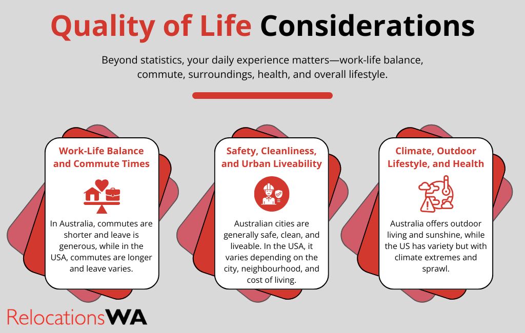 If you’re an Australian thinking of moving to the USA, you might earn more in some roles, but you’ll also carry higher costs and greater variation in quality of life depending on the state and city. Conversely, moving from the USA to Australia may mean slightly lower earnings in some jobs, but more predictable costs, shorter commutes, and a strong base for family life.